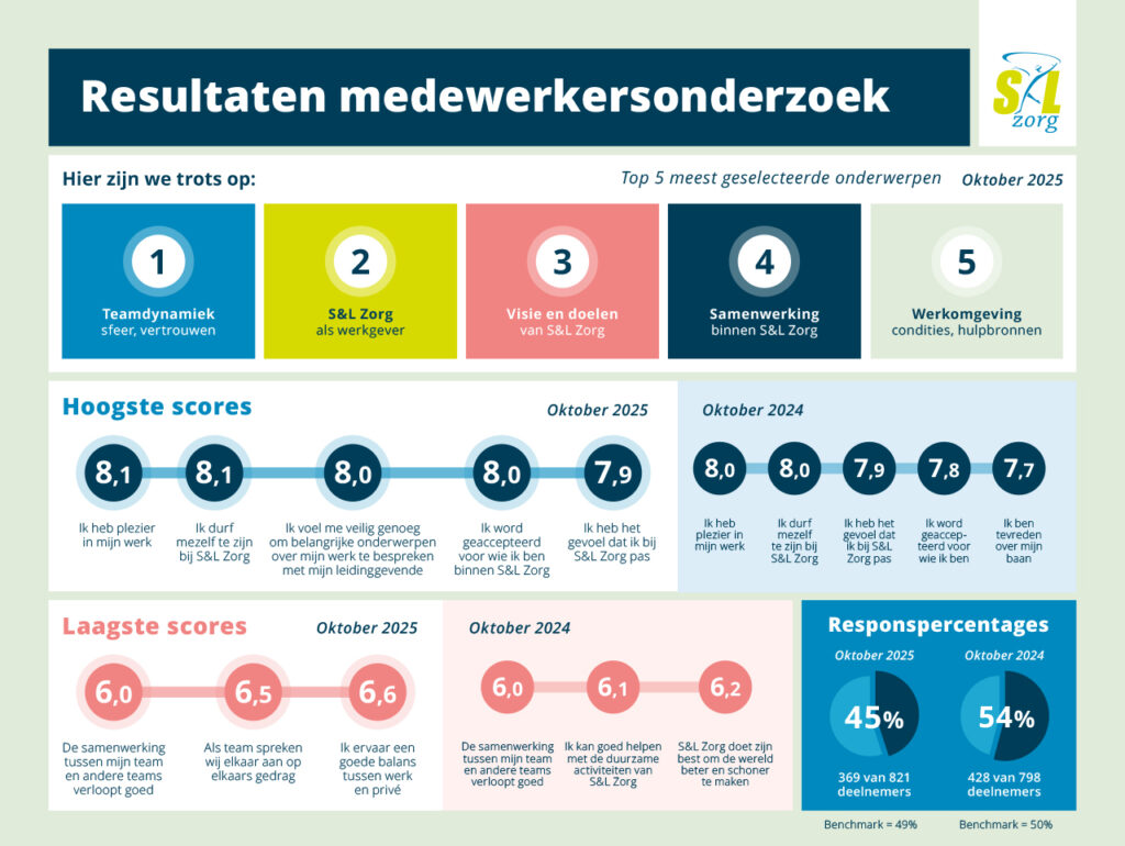 Elk halfjaar voert Effectory een medewerkersonderzoek uit bij S&L Zorg. De uitkomsten van het onderzoek in oktober 2025 zijn inmiddels binnen. De hoogste en laagste scores van dit jaar hebben we in onderstaande infographic vergeleken met die van vorig jaar. Ook staan hier de trotspunten in van oktober dit jaar.