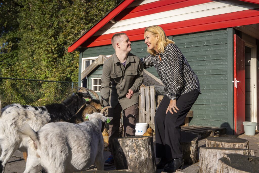 Milan woont sinds 2,5 jaar op Lambertijnenhof. Zijn dagen zijn goed gevuld: werken op de dierenweide, dagbestedingsgroep educatief op vrijdag en Brownies & Downies op dinsdag en donderdag. Daarnaast gaat hij klimmen bij de klimclub met zijn vriend Said. “Helemaal in die hoge boom”, zegt Milan glunderend. Op de dierenweide zorgt Milan goed voor de dieren. Hij verzorgt geiten, kippen en kuikens. Als Karin zegt dat hij gras geeft, corrigeert Milan direct: “Nee mama, stro!”